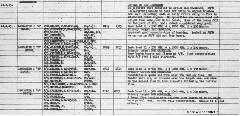 In maart 1944 werden de Stirlings ingeruild voor Lancasters. Op de foto een Lancaster van 75 Squadron onderweg voor een aanval op Osterfeld op 22 februari 1945. De piloot was Ronald Wynn Russell. De foto komt uit zijn collectie. Rechts een deel uit het Operations Record Book van die dag.