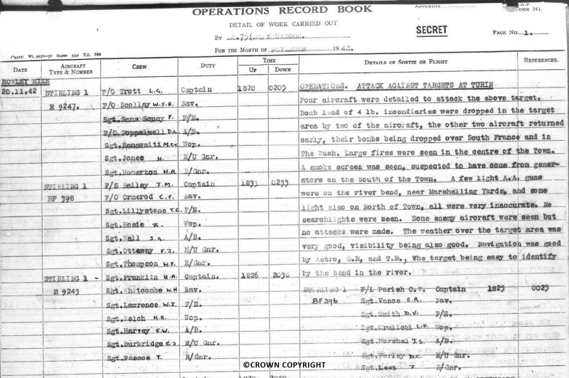 De eerste operationele vlucht van 75 squadron met de Short Stirling vond plaats op 20 november 1942. Het squadron is inmiddels overgeplaatst naar Rowley Mile, Newmarket. Van daar vertrekken vier Stirlings voor een aanval op Turijn.